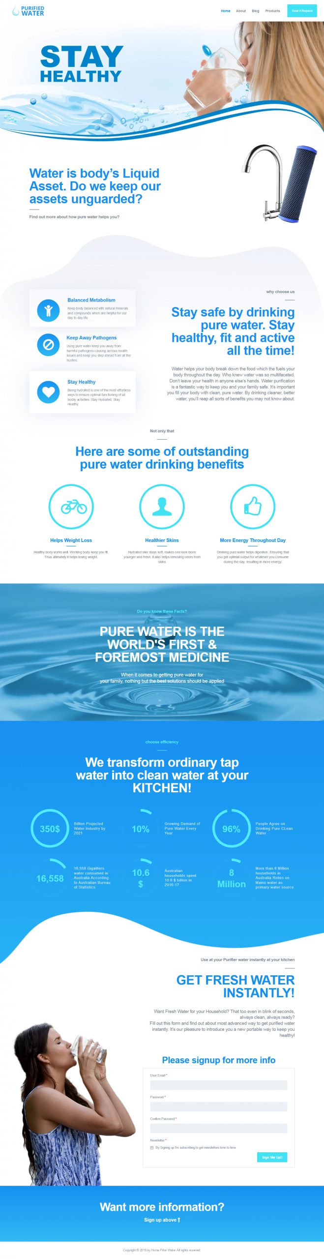 We designed the interface with a fresh white-and-blue palette, fluid graphical elements and clear messaging to visually communicate the idea of pure, safe drinking water. The hero section features strong lifestyle imagery and a bold headline, establishing immediate relevance and emotional connection.